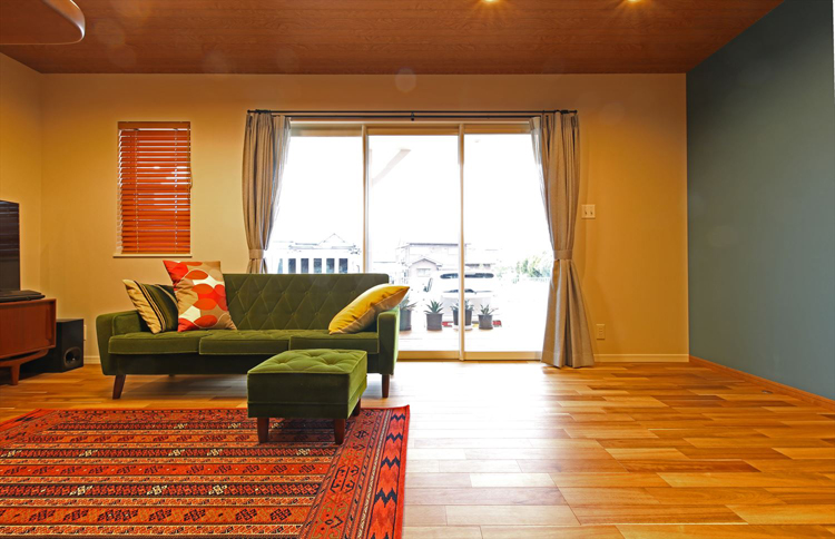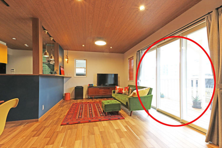 3連の引込窓を使い、広くデッキにつながる素敵な空間。毎日がリゾート感覚です。