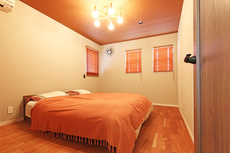 淡いグリーンの壁紙に、レッドブラウンで合わせたブラインドとベットカバーがいいです。焼けたチェリーの床も同系色で合わされています。時計はリビング同様、ジョージネルソンデザインの“サンバーストクロック”