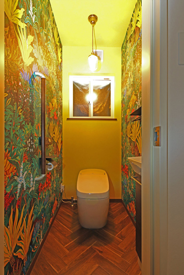 難しい柄をこのタイトな空間に用いたY様。後にメーカーが付けた名前はタイトル通りの“熱帯雨林のトイレ”。絶妙のバランスです。