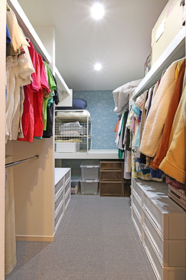 規則正しく整理されたクローゼット。カラフルな壁紙のストックもキチンと収納されています。