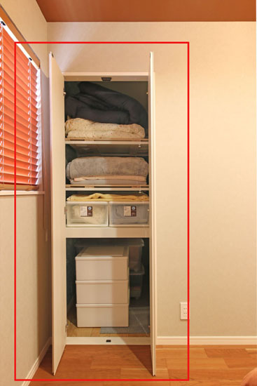 主寝室のドアを開けるとこんな感じでパジャマやお布団がサッと取り出せます。これもY様のアイデア。超便利です。