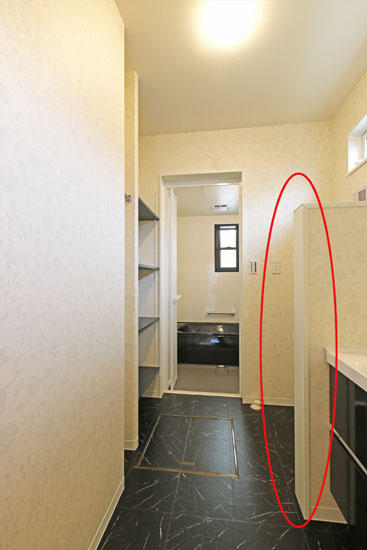 洗面所の洗面化粧台の横には袖壁を設けました。奥には洗濯機を置くので、見えにくくする工夫です。