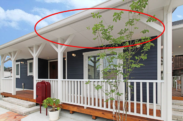 カリフォルニアスタイル、サーファーズハウスの代名詞であるカバードポーチ。平屋ののびやかさを一層引き立てます。