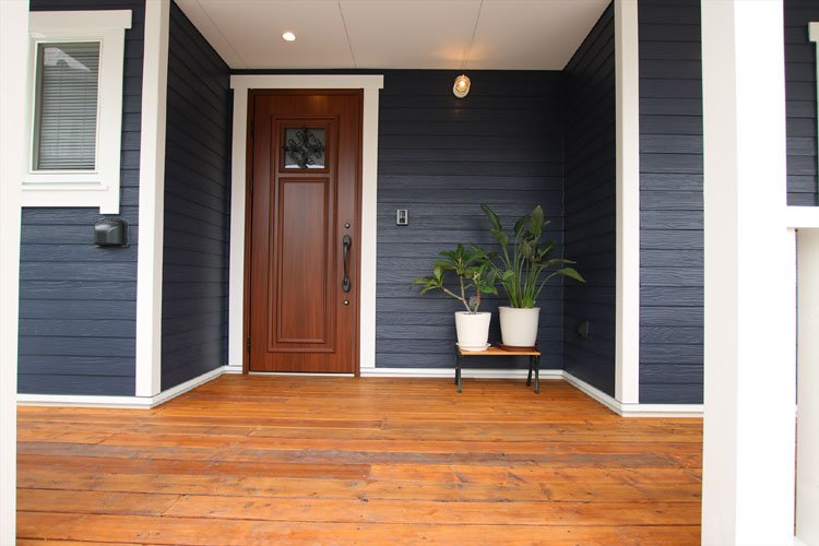 少し明るめのチーク色で仕上げたデッキエントランス。ネイビーの外壁によく合っています。