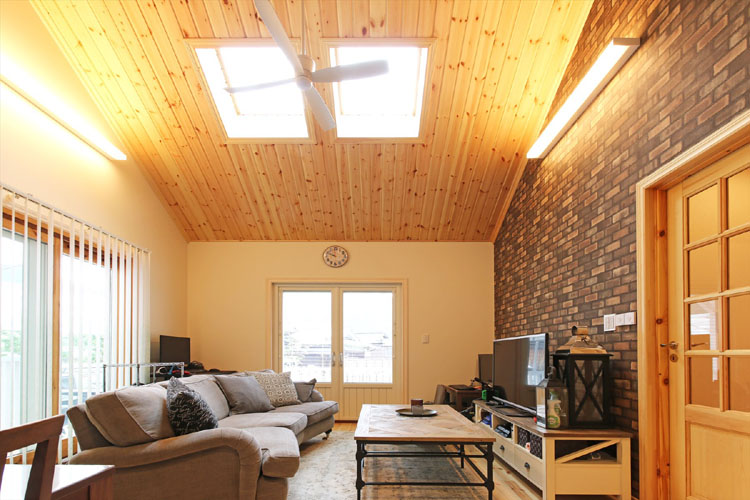 緩く斜めに大きく広がる天井は平屋ならではの空間。スウェーデン直輸入の家具が本当に良く似合っています。シーリングファンや天窓も空間を美しく演出してくれています。