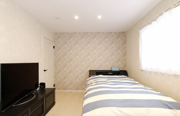 リビングよりワントーン薄い色のヘリボーンの壁紙をアクセントに。ボーダーの淡い水色のベッドシーツとの相性もいいです。