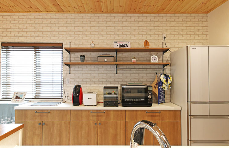 吊り戸部分を無くして、飾り棚で仕上げたカップボード。棚は可動式で、見た目も使いやすさも併せ持っています。
