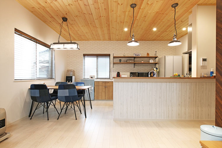 キッチンやダイニングのペンダントライトはS様が探してこられたアイテム。 スチールと木のコラボレーションが素敵です。