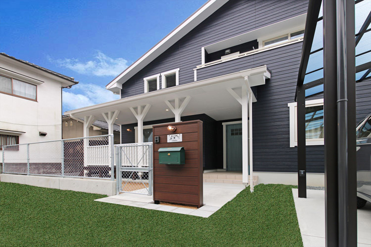 子育て世代のS様ご一家。雨天の日も濡れにくいよう、カーポートをエントランス近くに計画されました。使いやすさと見た目の美しさをあわせ持っています。