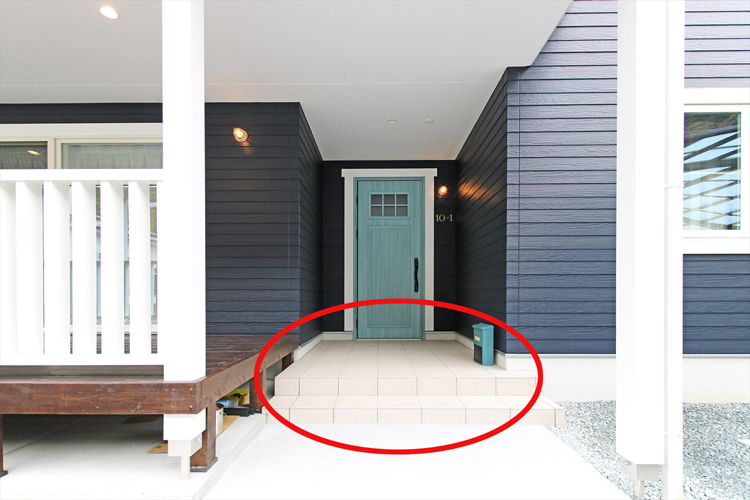 カバードポーチの下にあるデッキとポーチ部分を分け、ポーチはタイルで仕上げました。メンテナンスしやすく計画しています。