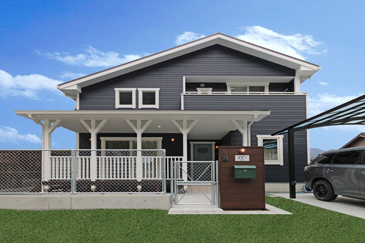 S様の思い描いた家は勾配天井のあるサーファーズハウス。大屋根を下げて特徴のある外観にし、大きなカバードポーチを付けました。カリフォルニア住宅の定番スタイルにS様流をアレンジした印象深い外観に仕上がっています。