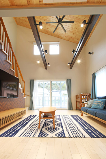 長い梁が特徴的なリビング。吹抜けの天井は勾配天井になっていてパインを貼っています。