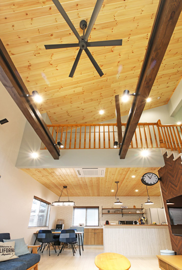 欄干手摺や天井パインなどの木質のテクスチュアに 黒い時計やシーリングファンがアクセントになっています。