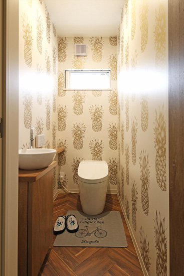 パイナップルがプリントされた遊び心タップリの トイレ。造作手洗もある、正に “レストルーム”です。