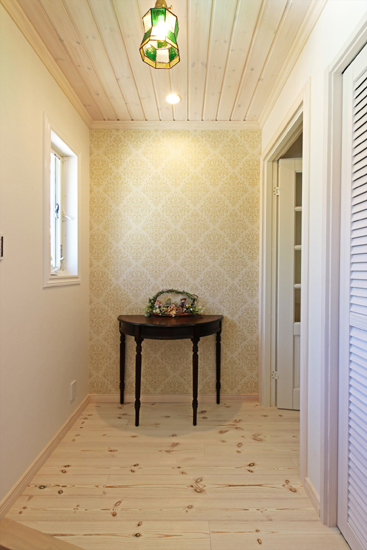 玄関に入るとアンティーク家具のコンソールがお出迎え。 アクセントクロスと合わせて素敵な空間を演出してくれています。