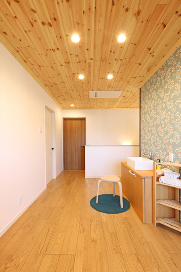 ホールに設置された洗面化粧台の場所にはスロップシンクを設置されています。上靴や泥汚れを下洗いしたりするのに便利。子育て世代のF様邸にはマストアイテムです。