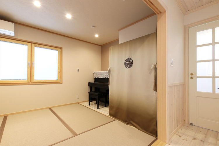 重い桐の婚礼箪笥の床は北欧パインの板間になっています。横には同じく重いピアノをレイアウト。F様のグッドアイデアです。