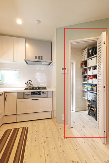 キッチンから出入りしやすい勝手口をパントリーに設置されました。外からの荷物も入れやすく、 広いパントリーは収納力抜群です。