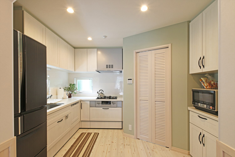 独立キッチンはF様のこだわりのスタンダードな欧米スタイル。使いやすく、白いキッチンに淡い緑の壁紙が本当によく合っています。