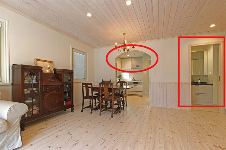 独立型のキッチンとの間の垂れ壁はR調に、洗面への垂れ壁は額縁で仕上げられています。 その間には腰壁をあしらい、とても素敵な空間になっています。