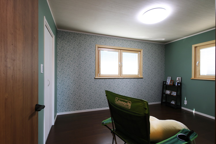 お子様が小さいため、一階で家族でお休みになるので、今はシアタールームの主寝室。グリーンのウィリアムモリスの壁紙が本当に素敵です。