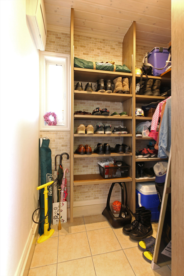 キャンプ道具などもしっかり収納できる玄関横の大きな収納。お子様のレインコートなど衣類も掛けられるようになっています。