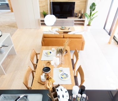 平均的な土地の大きさから想定した16帖のLDKを再現。配置や間取り、家具の位置...。実際の広さを知ることで、具体的な「こうしたい!」が浮かびます。