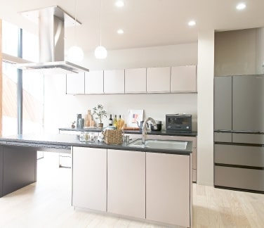 机の上で料理してる?かのようなHIコンロを備えたシステムキッチンで、お掃除も簡単でお子様にも安心!
