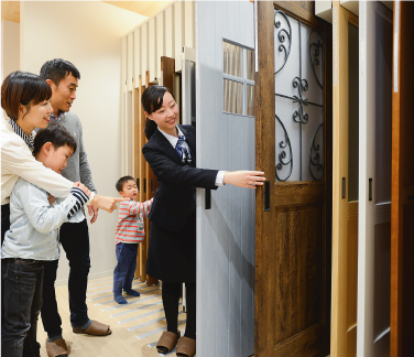 扉のガラスやデザイン、色などたくさんの扉を実物大で展示。実際にみて、触れて選べます。