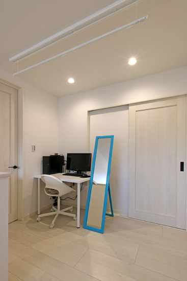 2階の廊下を少し広げるだけで、こんな素敵な書斎兼物干し場になりました。無駄の無い空間利用です。