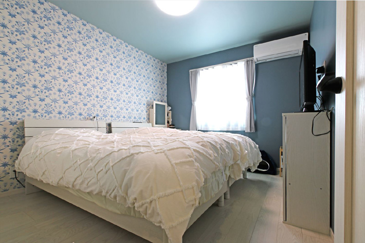 ウィリアム・モリス初期の三つの壁紙デザインのひとつである「ヒナギク」 当社では初採用のウィリアムモリスの代表作を主寝室の壁紙に採用されました。 青色をベースにした空間に、折り柄の真っ白なシーツが印象的な主寝室です。