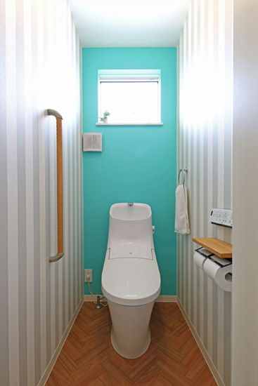 洗面所と同じ色のクロスと思いきや、ワントーン緑を濃く加えた壁紙をセレクト。ライトブラウンの床やペーパーホルダーに良くマッチしています。