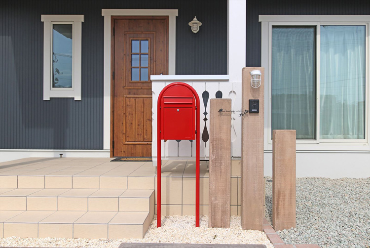 北欧の家には本当によく似合う真っ赤なポスト “ボビ”。ネイビーで統一された外観に華を添えます。