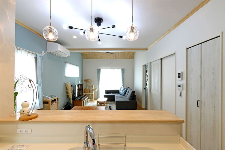 ドアとアクセントクロスをスカイブルーの挿し色で仕上げた リビングルーム。爽やかな空間に仕上がりました。