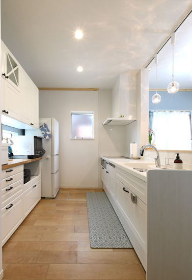 框組の白い扉でセットアップされたキッチン。 カップボードはIKEAのオリジナルで北欧の雰囲気タップリです。
