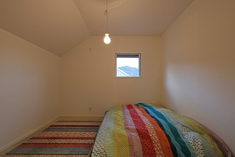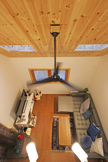 パインを貼った勾配天井には北欧製の天窓を設置 斜めに展開する空間は日々の生活をリゾートに変えます。