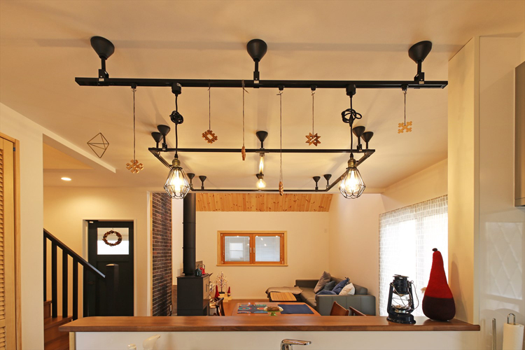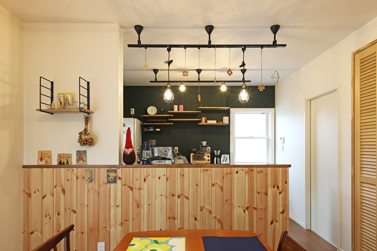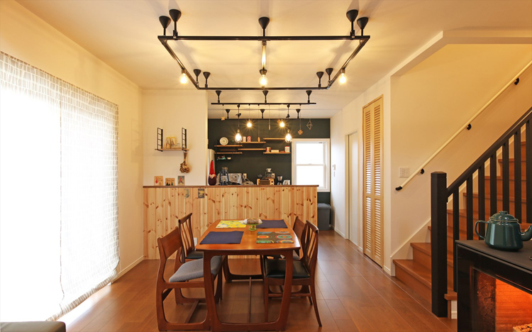 アクセントクロスやパインの腰板などをあしらった北欧空間に メタル調の黒い吊り下げ式のショップライン照明をプラスしたダイニング。カッコよさと可愛さを見事に共存させたK様・・・ 凄いです。