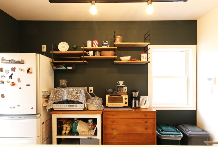 パインの素材感に黒いメタルのコラボレーション。そこにダークグリーンのクロスが加わって、本当にいい感じです。