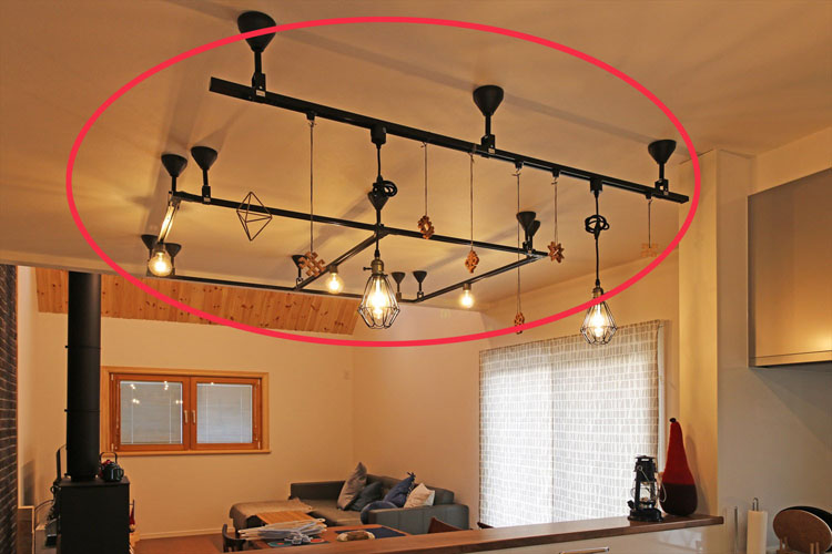 K様が一目惚れした、インダストリアルな雰囲気タップリの吊り下げ式ショップライン照明。ペンダントやエジソンバルブがこの空間に良くマッチしています。