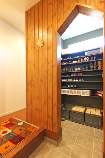 エイジングペイントで素敵に染まったパインの壁。三角のゲートは大屋根の外観をイメージしたもの。 収納に入るのが楽しくなりそうです。