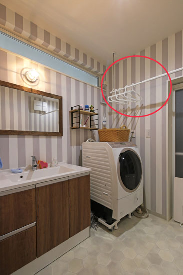 マリンランプと造作鏡が素敵な雰囲気の洗面所。 物干しもあり、機能性もしっかり備えています。