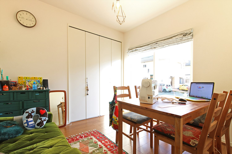 ハンドメイド作家のK様の奥様のアトリエ。デザインや製作はもちろん、 打ち合わせもできるよう、テーブルとソファをレイアウトされています。大きな窓は日当たりも良く、作品の搬出にも便利との事です。