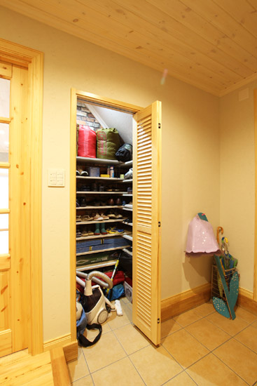 階段下を利用した、土間のシューズクロークです。靴だけでなく、キャンプ用品などもしっかり収納されています。