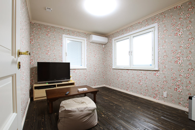 宿泊客の多いF様宅は、和室の代わりに1階に客間があります。ブルーグレー&花柄の壁紙は白いペイント窓と黒いスウェーデン産ブラスト床にベストマッチ。 素敵な空間に仕上がりました。