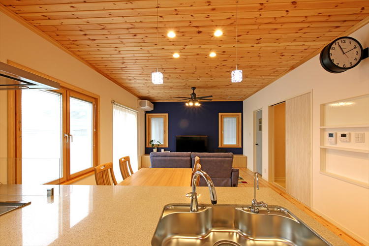 リビングのアクセントクロスはネイビーブルーで仕上げ、グラデーション するように青系のドアとソファをコーディネイトされています。何ともスタイリッシュなリビングに仕上がっています。