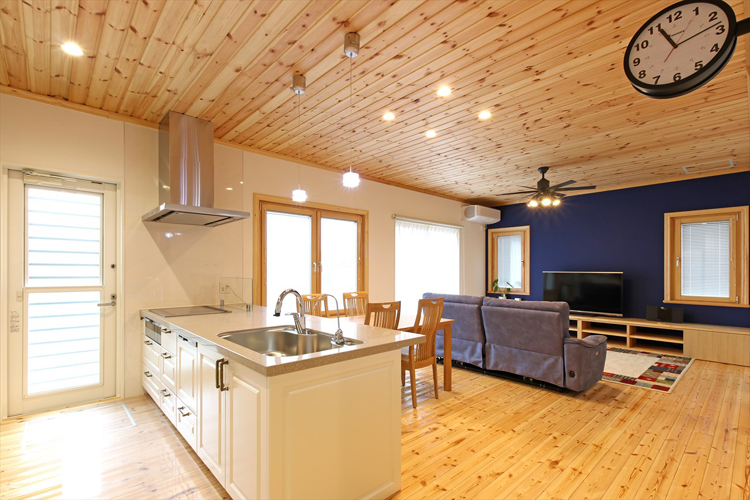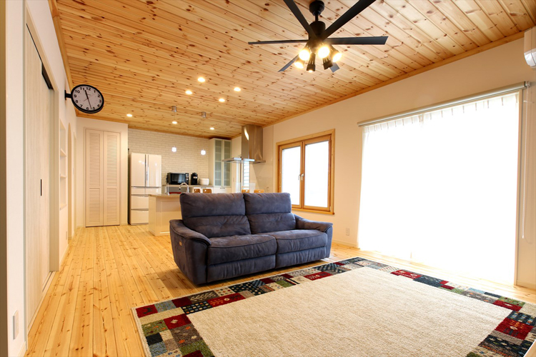 ハイテクなZEHの家なので、インテリアは逆にクラシカルなテイストで、 素材も色もナチュラルパインで仕上げました。黒いシーリングファンとダブルフェイス時計がアクセントになっています。