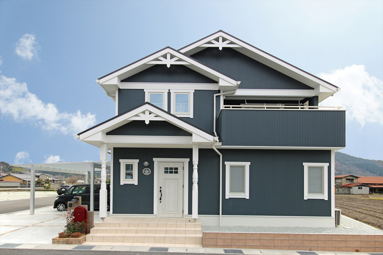 スウェーデンホーム独特の印象的なファサードに、ネイビーブルーの 鮮やかな外壁をセレクトされたO様。白とネイビーブルーが見事に調和し、街のランドマークになっています。