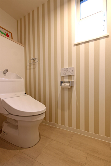 優しい色で仕上げたトイレ派手すぎず、楽しい空間に仕上がりました。