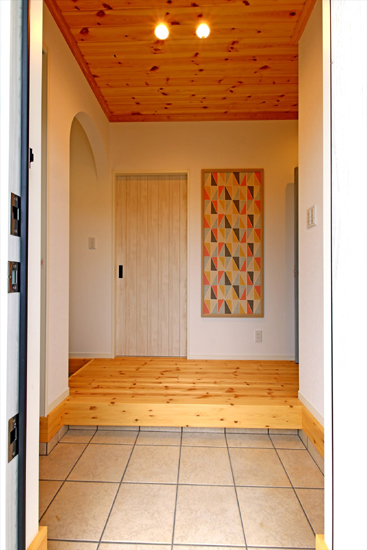 床も天井もパイン材で仕上げたナチュラルな 空間にエコカラットのテキスタイルをプラス。なんとも印象的な玄関に仕上がっています。