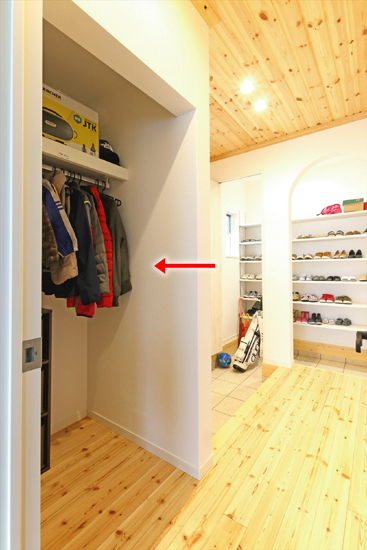 お子様の保育園の制服や仕事着、アウター等ををサッとかけられるコートクロークは 子育て真っ盛りのO様一家の大活躍空間。技ありの収納アイテムです。
